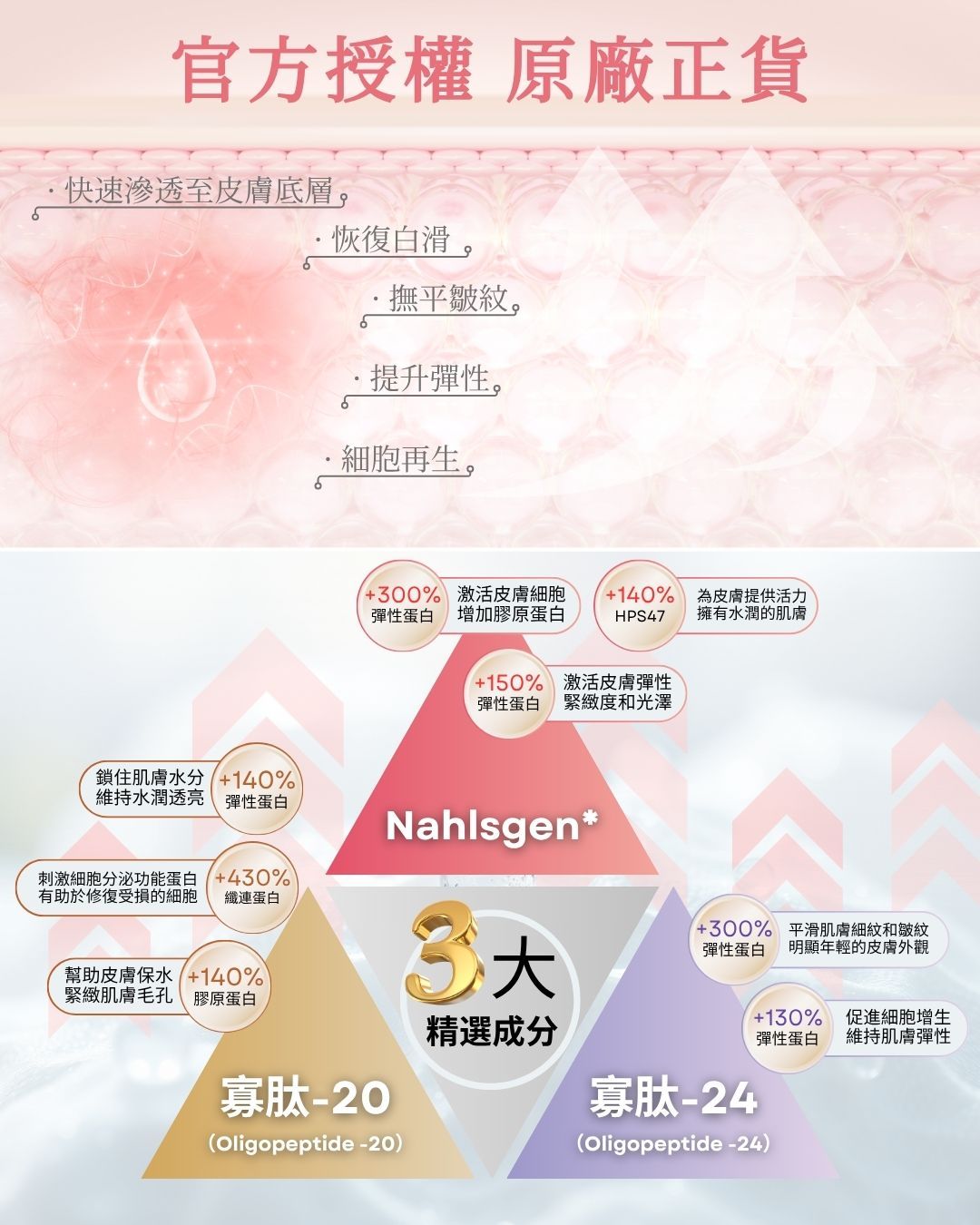 生長因子的護航者。透過為生長因子加入超氧化物歧化酶 (SOD),進行人工強化。將天然的生長因子與之一起使用,可以將眾多生長因子送達到深層,同時保護對各種有物質較為脆弱的生長因子。